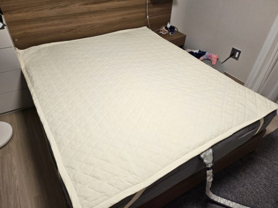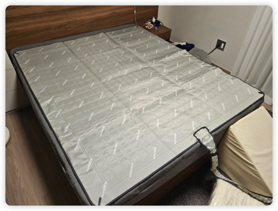 매트 두께가 1mm밖에 되지 않아서 침대 매트리스의 쿠션감을 그대로 느낄 수 있다는 점이 정말 좋았습니다. 호스가 지나가는 자리가 느껴지지 않으니 예민한 저도 거슬림 없이 편안하게 누워 있을 수 있었어요.