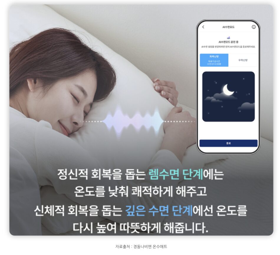 이 제품은 단순히 열을 내는 기계가 아니라 제 수면을 관리해 주는 느낌을 줍니다. 나비엔 하우스 앱과 연동하면 수면 중 제 호흡 소리를 분석해서 수면 단계에 맞춰 온도를 자동으로 조절해 주는 AI 숙면 솔루션 기능이 정말 똑똑해요.