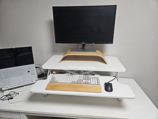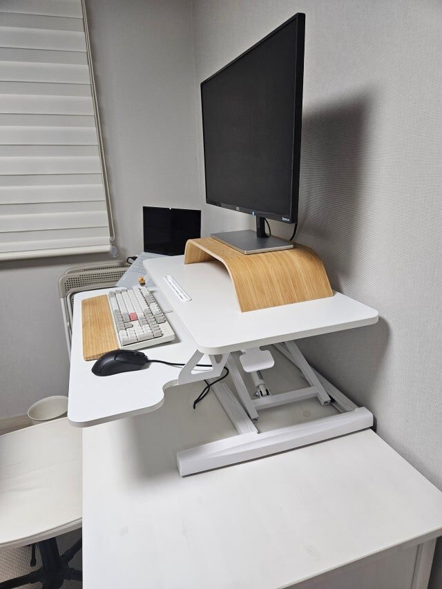 처음 제품을 받아서 박스를 뜯었을 때 생각보다 묵직한 무게에 조금 당황했었어요. 아무래도 고정형이 아니라 책상 위에 올려두고 쓰는 타입이다 보니 지지력이 중요해서 그런 것 같더라고요. 처음 며칠은 평소 쓰던 책상 높이보다 미세하게 높아진 키보드 위치 때문에 팔목이 조금 어색하기도 했습니다. 하지만 이 묵직함 덕분에 최고 높이로 올려서 서서 일할 때도 흔들림 없이 탄탄하게 잡아주는 걸 보고 신뢰가 확 생겼어요. 만약 다시 구매 시점으로 돌아간다고 해도 제 허리 건강을 생각하면 무조건 이 제품을 다시 결제했을 거예요.