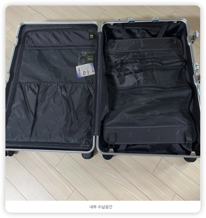 내부 공간도 사용자 편의를 많이 고려했다는 게 느껴졌어요. 양쪽으로 나뉘어 짐을 고정해주는 파티션이 잘 되어 있어서 옷가지나 소품들이 뒤섞이지 않게 깔끔하게 정리할 수 있었어요.