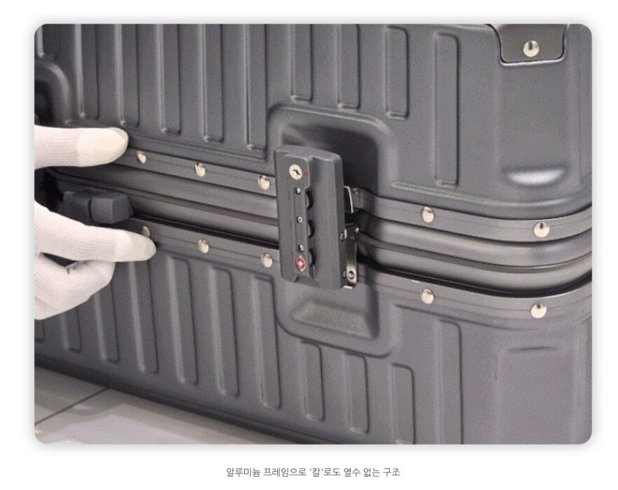 요즘은 여행지에서 지퍼를 뚫고 소지품을 훔쳐가는 수법이 많다고 해서 걱정이었는데요. 이 캐리어는 지퍼가 없는 매립형 프레임 방식이라 칼이나 뾰족한 도구로 절대 열 수 없는 구조였어요.