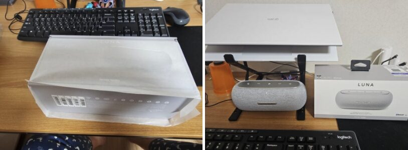 박스를 개봉하자마자 느껴지는 고급스러운 패브릭 소재가 정말 인상적이었어요. 상단 부분은 아노다이징 처리된 알루미늄 패널로 마감되어 있어서 손에 닿는 촉감부터 일반적인 저가형 스피커와는 차원이 다르더라고요.