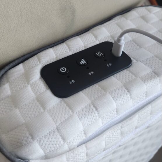 이 베개의 핵심은 열 개의 안마구가 양쪽에서 굴러가며 목 근육을 직접 주무르는 듯한 느낌을 준다는 거예요. 단순히 진동만 주는 게 아니라 괄사 요법처럼 목의 뭉친 곳을 꾹꾹 눌러주니까 샵에서 관리받는 기분이 들더라고요. 3단계로 강도를 조절할 수 있어서 유난히 목이 뻣뻣한 날에는 강하게, 평소에는 부드럽게 설정해서 사용했어요.