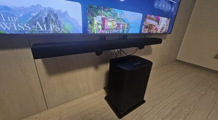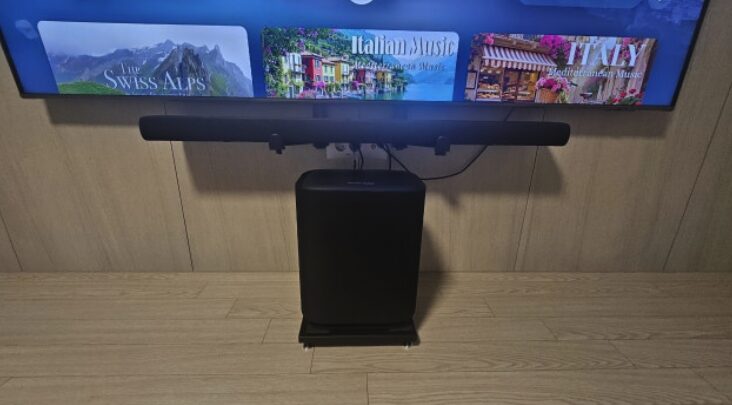 다만 본체 가로 길이가 115cm로 꽤 긴 편이라 거실장의 크기를 미리 확인해 보시는 것이 좋아요. 75인치 이상의 대형 TV와 배치했을 때 가장 조화로운 디자인을 보여주더라고요. 단품만으로도 훌륭하지만 더 깊은 저음을 원하신다면 나중에 전용 서브우퍼를 추가해서 시스템을 업그레이드할 수 있는 확장성도 갖추고 있어요.
