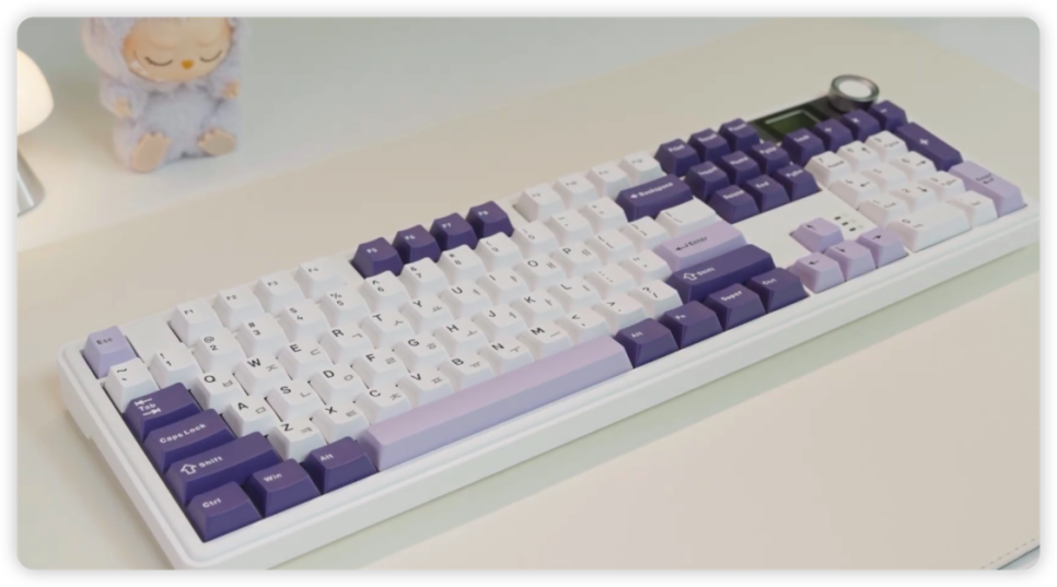 이 키보드의 꽃은 우측 상단의 LCD 스크린입니다. 배터리 잔량이나 현재 연결 모드를 직관적으로 확인할 수 있어 무선 사용 시 불안함이 없습니다. 특히 전용 앱을 통해 나만의 GIF 움짤을 넣을 수 있는데, 밋밋했던 책상 분위기가 확 살아나는 효과가 있습니다. 옆에 달린 노브로 볼륨을 즉시 조절하거나 메뉴를 선택하는 손맛도 상당히 뛰어납니다. - 눈치 보지 않는 완벽한 저소음 타건감