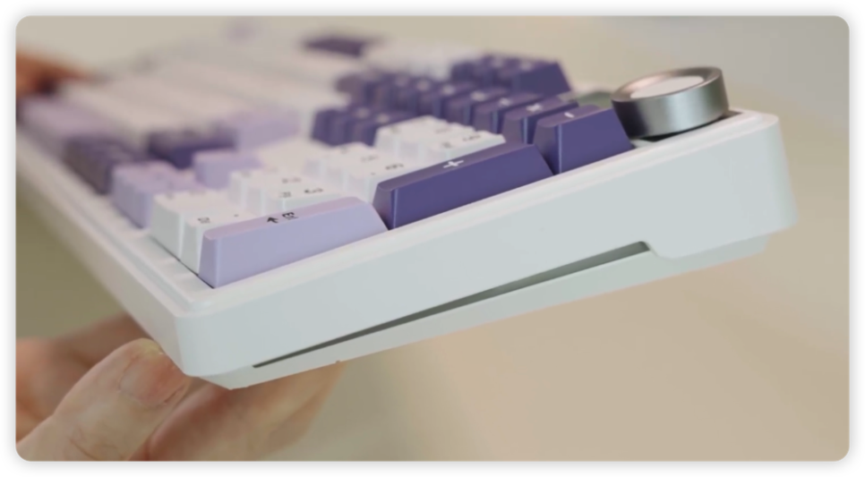 오래 사용해도 번들거림이 적은 PBT 재질의 키캡을 사용했습니다. 글자가 지워질 걱정 없는 이중사출 방식이라 각인이 매우 선명하며, 체리 프로파일 설계로 손가락이 닿는 각도가 자연스러워 장시간 타이핑 시에도 손목 피로감이 확실히 덜합니다. 화이트 베이스에 보라색 포인트가 들어간 디자인은 데스크테리어의 정점을 찍어줍니다.