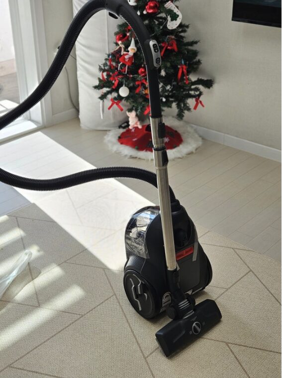 9m에 달하는 긴 코드 덕분에 30평대 아파트 거실에 꽂아두면 안방까지는 무난하게 커버가 됩니다. 부드러운 소프트 휠이 달려 있어 본체를 끌고 다닐 때 바닥 긁힘 걱정도 없고 소음도 생각보다 저음이라 밤늦은 시간만 아니면 크게 부담스럽지 않았습니다.