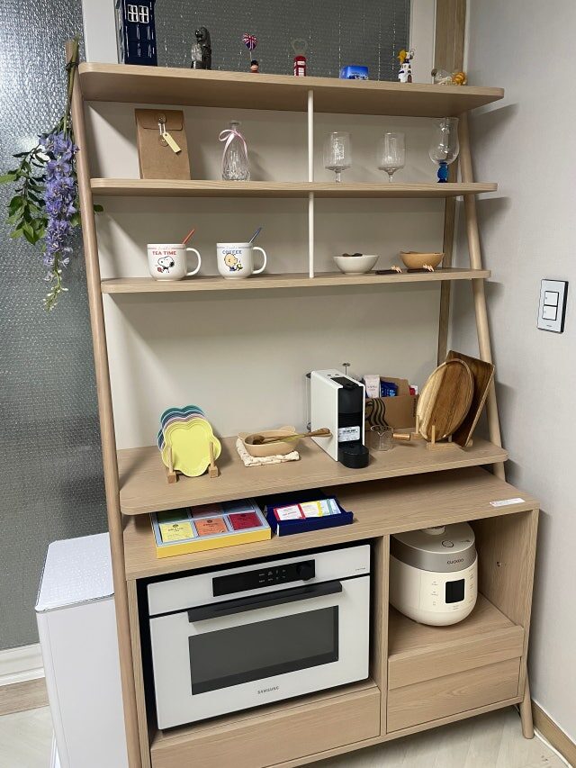 공간 활용도가 정말 좋아요. 상단 선반에는 자주 쓰는 컵이나 작은 소품들을 장식하기 좋고, 수납장 메인 공간에는 커피머신과 토스트기를 배치하기에 넉넉합니다. 가장 마음에 들었던 건 배선홀이에요. 지저분한 전선들을 뒤로 깔끔하게 정리할 수 있어서 주방이 훨씬 정돈되어 보여요.