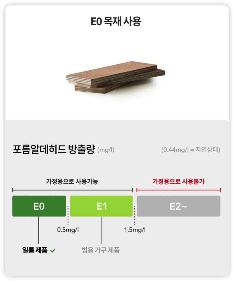 | 소재 | E0 등급 목재(PB/LPM), 원목(목봉다리) |