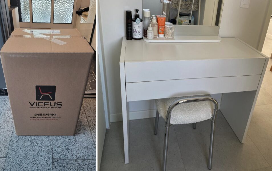 실제로 앉아보니 쿠션감이 적당해서 화장을 하거나 잠깐 휴식을 취할 때 몸을 잘 지지해 준다는 느낌을 받았어요. 의자 자체가 무겁지 않아서 청소할 때나 위치를 옮길 때 손목에 무리가 가지 않아 참 편리했지요. 다만 조립할 때 나사를 조이는 과정이 생각보다 힘이 들어갈 수 있고 커버를 처음 씌울 때 사이즈가 꽤 타이트해서 손가락이 조금 아플 수 있다는 점은 참고해 주세요. 그래도 한 번 제대로 조립해 두면 흔들림 없이 안정적으로 사용할 수 있어서 가격 대비 품질이 아주 훌륭한 제품이라고 생각해요.