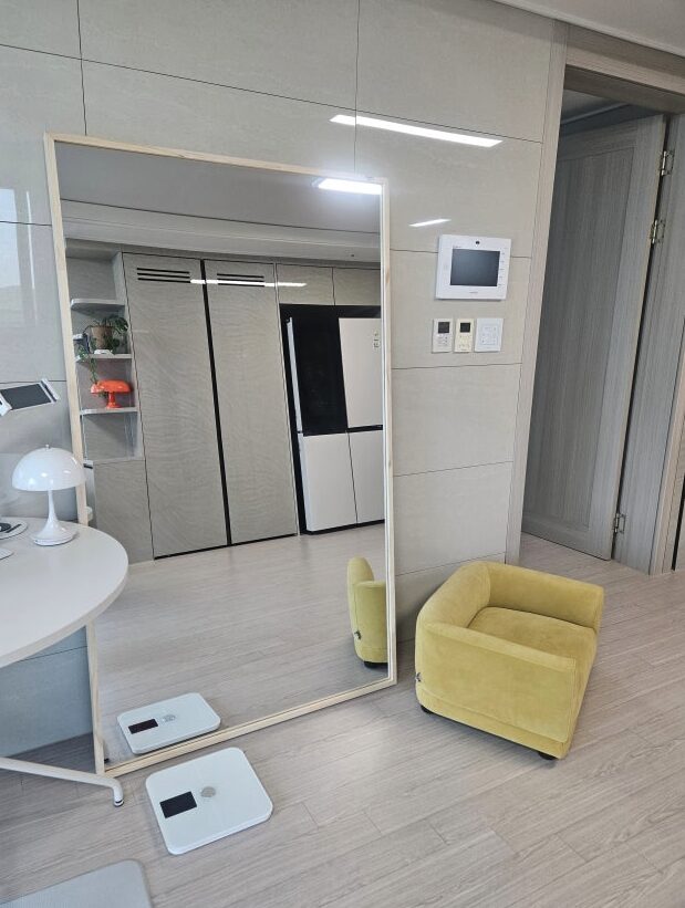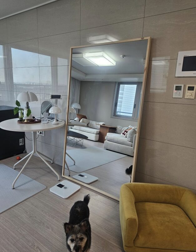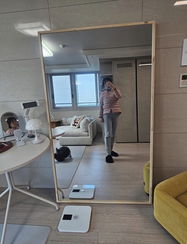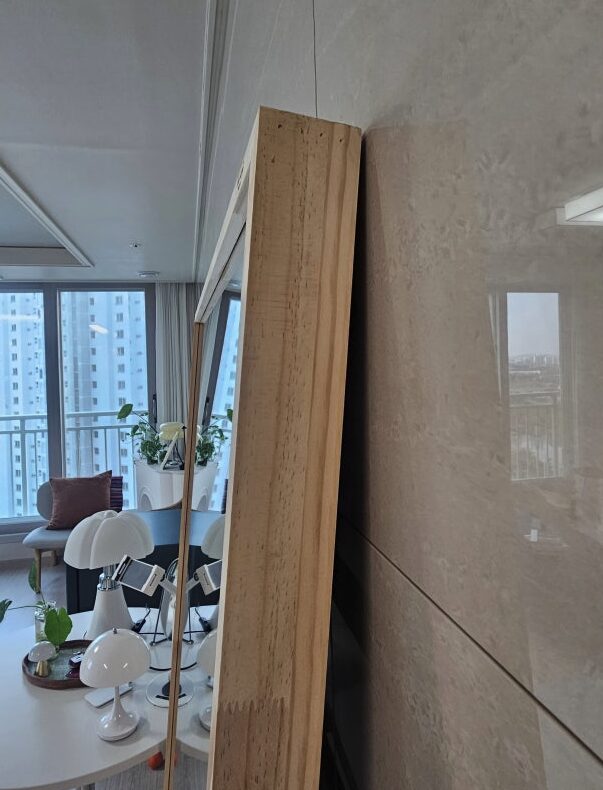 다만 거울 면적이 워낙 넓다 보니 먼지가 앉거나 손자국이 남았을 때 닦아내야 할 범위가 꽤 넓다는 점이 조금 번거롭게 느껴졌어요. 그리고 생각보다 무게가 제법 나가서 위치를 옮길 때 혼자보다는 두 명이서 조심스럽게 옮기는 것이 훨씬 안전할 것 같더라고요. 한 번 자리를 잡으면 이동하기 쉽지 않으니 설치하기 전에 미리 신중하게 위치를 선정하는 것을 추천드려요.