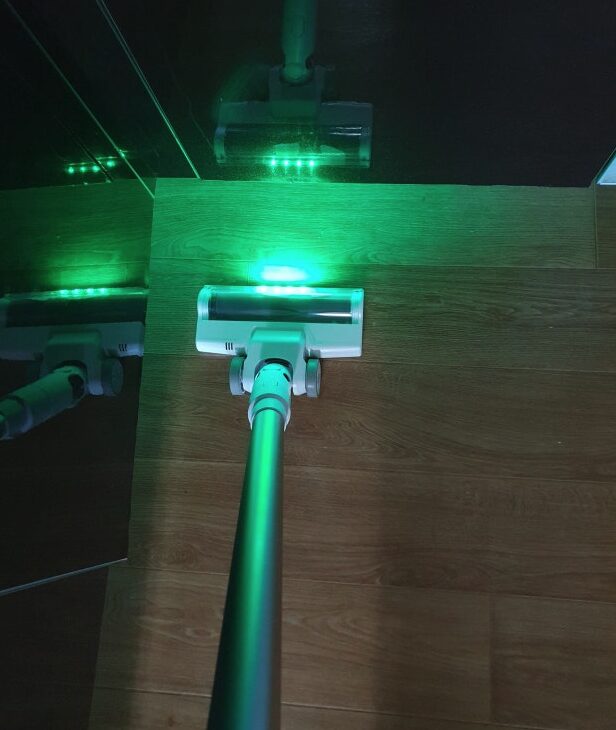 헤드 앞쪽에 달린 LED 그린라이트는 어두운 가구 밑 먼지를 아주 선명하게 비춰줍니다. 밝은 곳에서는 보이지 않던 미세한 머리카락이나 먼지들이 빛을 받으면 하얗게 드러나서 훨씬 꼼꼼하게 청소할 수 있었습니다. 청소의 결과물을 눈으로 바로 확인하니 더 개운한 느낌이 들더라고요.