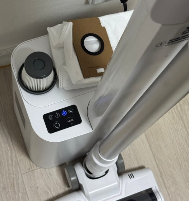 홈리아 더스트제로의 핵심은 역시 클린스테이션입니다. 청소를 끝내고 거치대에 툭 꽂아주기만 하면 충전과 동시에 먼지통 비움이 시작됩니다. 2.5L 대용량 먼지봉투 덕분에 3달에 한 번 정도만 봉투를 교체해 주면 되니 정말 편했어요.