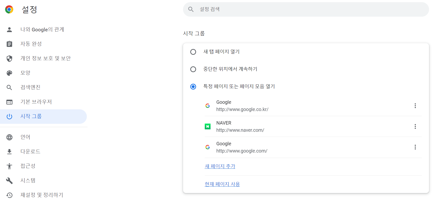 사실 위 사진처럼 chrome://settings 페이지에서 [시작 그룹] 기능을 이용하면